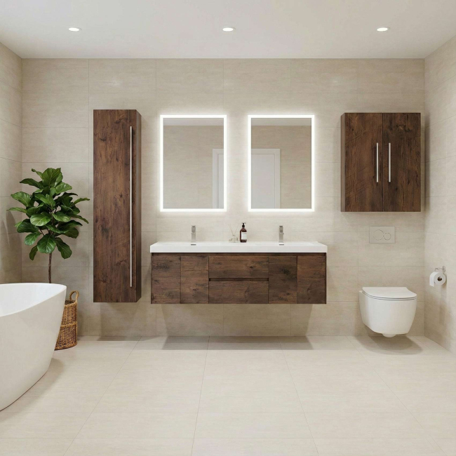 The cabinet comes in Rosewood finish, feauring 5 storages units and one door with BLUM soft closing hinges, door can open left or right. It matches nicely with all the rosewood finished vanities we offer, cabinet is fully assembled.