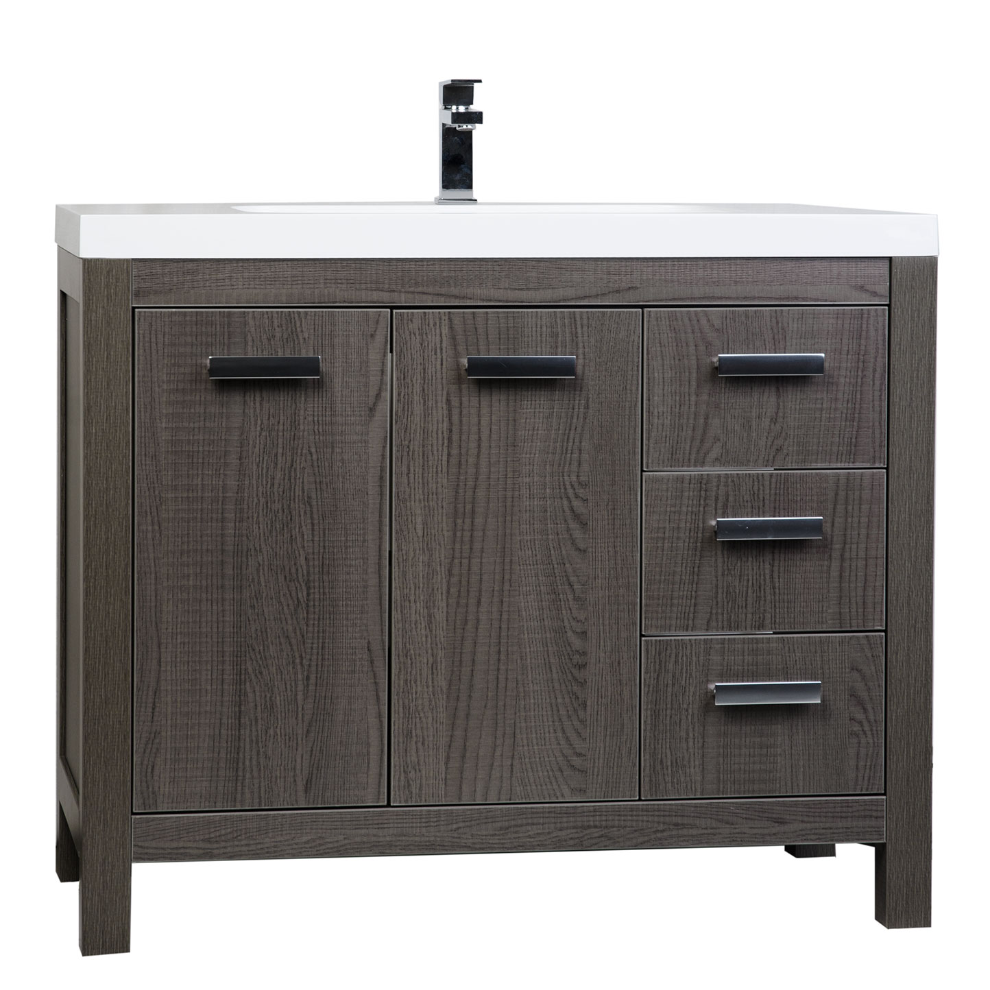 The 39.25' vanity is defined by its clean white resin top with inergrated sink. This beautifully assembled vanity provides large storage area behind its two doors and three functional drawers. The integrated sink combines with high gloss white finished cabinet and polished chrome hardware to complete this bathroom decor.