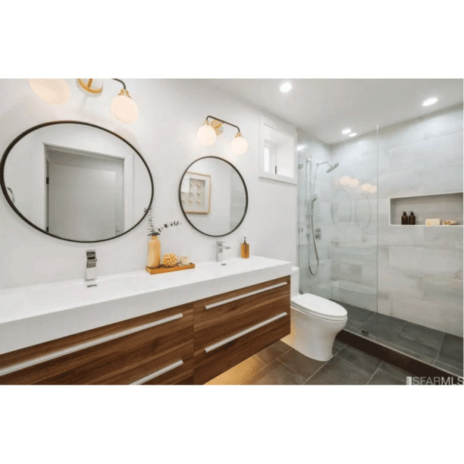 - Materials: Plywood and furniture grade MDF, white resin stone countertop with integrated sink