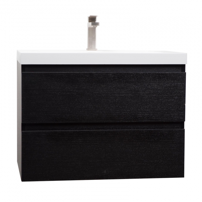 This 29.5" Angela wall mounted European styled bathroom vanity provides a large integrated counter and 2 soft closing drawers with cut out for plumbing,giving bathrooms tremendously clean, contemporary lines with exchangeable space. All the wooden elements are  finished with a polyester resin finish to guarantee total water resistance.  The elegant integrated resin countertop is fitted for a single faucet mechanism.Â