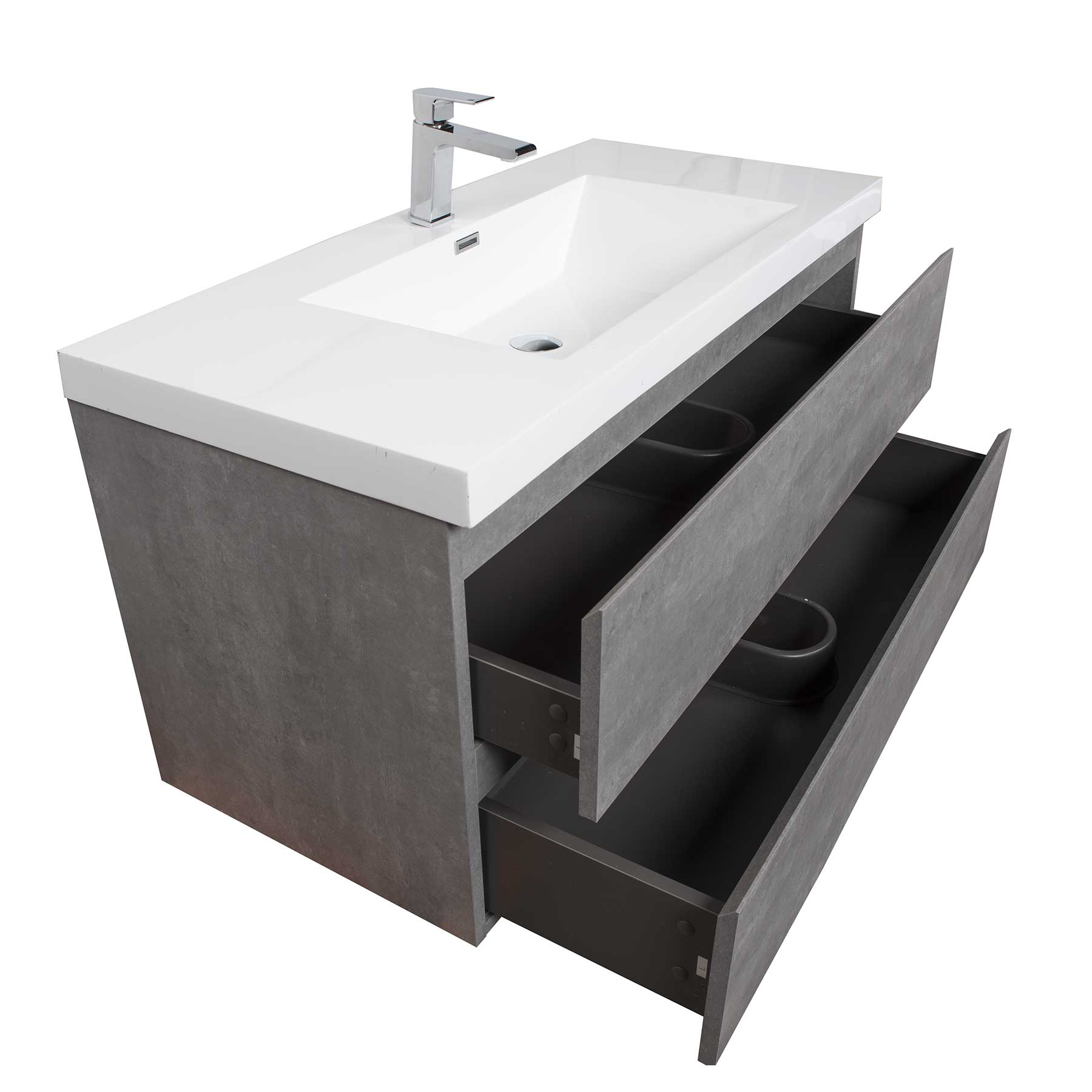 This 41.9" Angela wall mounted European styled bathroom vanity provides a large integrated counter and 2 soft closing drawers with cut out for plumbing,giving bathrooms tremendously clean, contemporary lines while exchangeable space. All the wooden elements are  finished with a polyester resin finish to guarantee total water resistance.  The elegant integrated resin countertop is fitted for a single faucet mechanism.Â