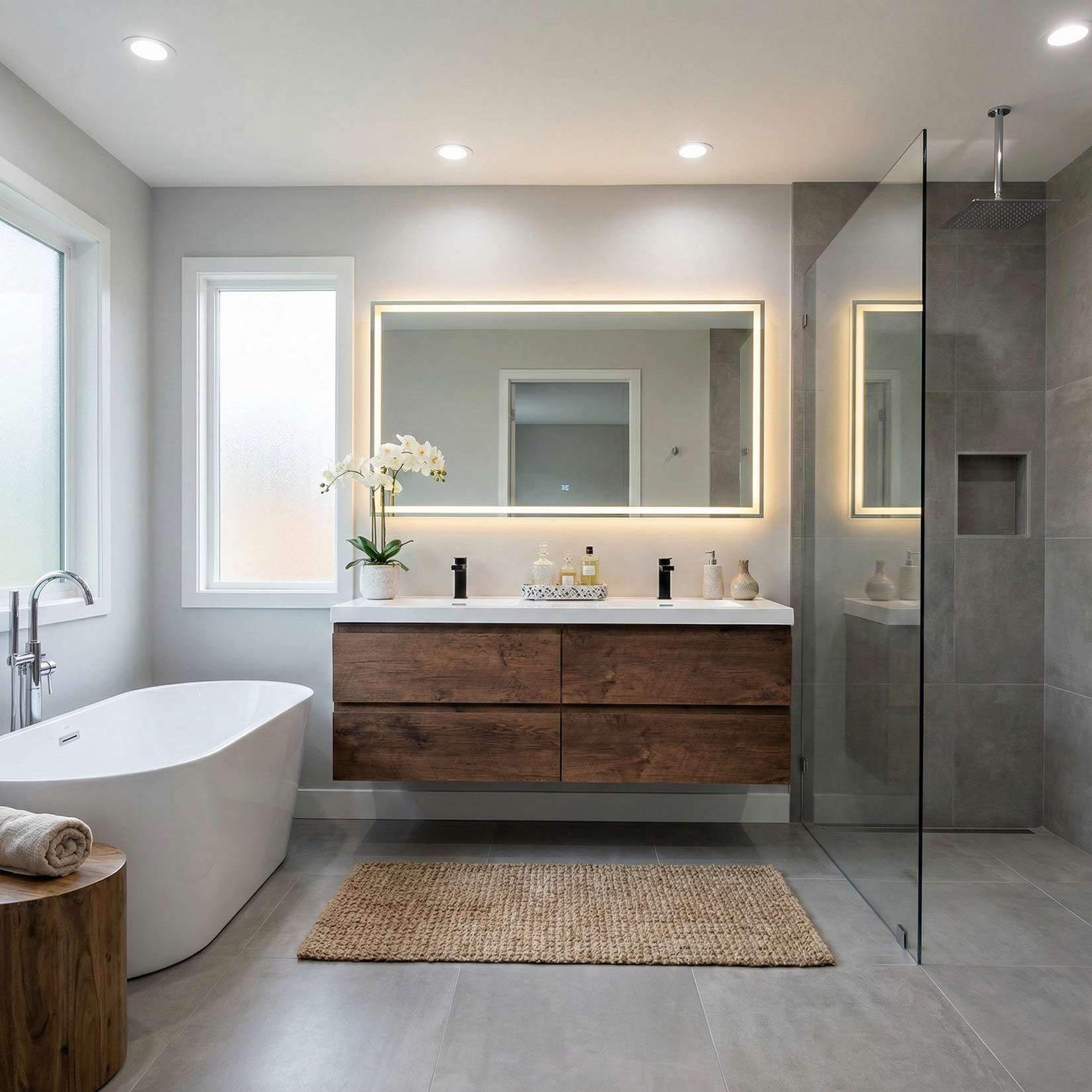 Measure up with handleless cabinetry there’s nothing nicer than clean, clutter-free countertops.  With a one-piece top and trendy handleless drawers integrated into a single piece, this Angela wall mounted double vanity is a textbook example of slick design.Â