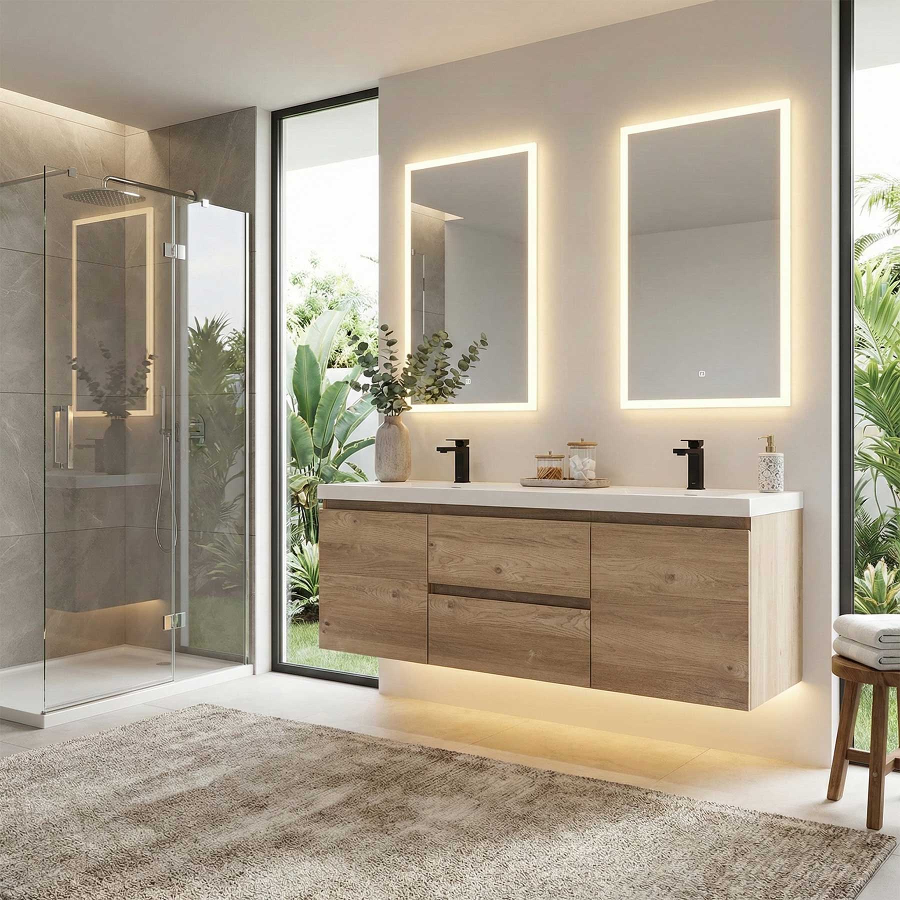 Once considered a niche design feature, handleless bathroom vanities have grown in popularity, fueled by an increasing demand for contemporary styles, minimalist looks and the need to maximize space. Handleless design creates a streamlined flow of bathroom units that’s beautiful as well as efficient. The resulting look is chic, clean and clutter-free. This handless 59" Angela  double vanity features (2) fully functional soft-closing drawers and (2) doors. Contertop is avilalbe in polished white and solid surface matte white(extra cost).