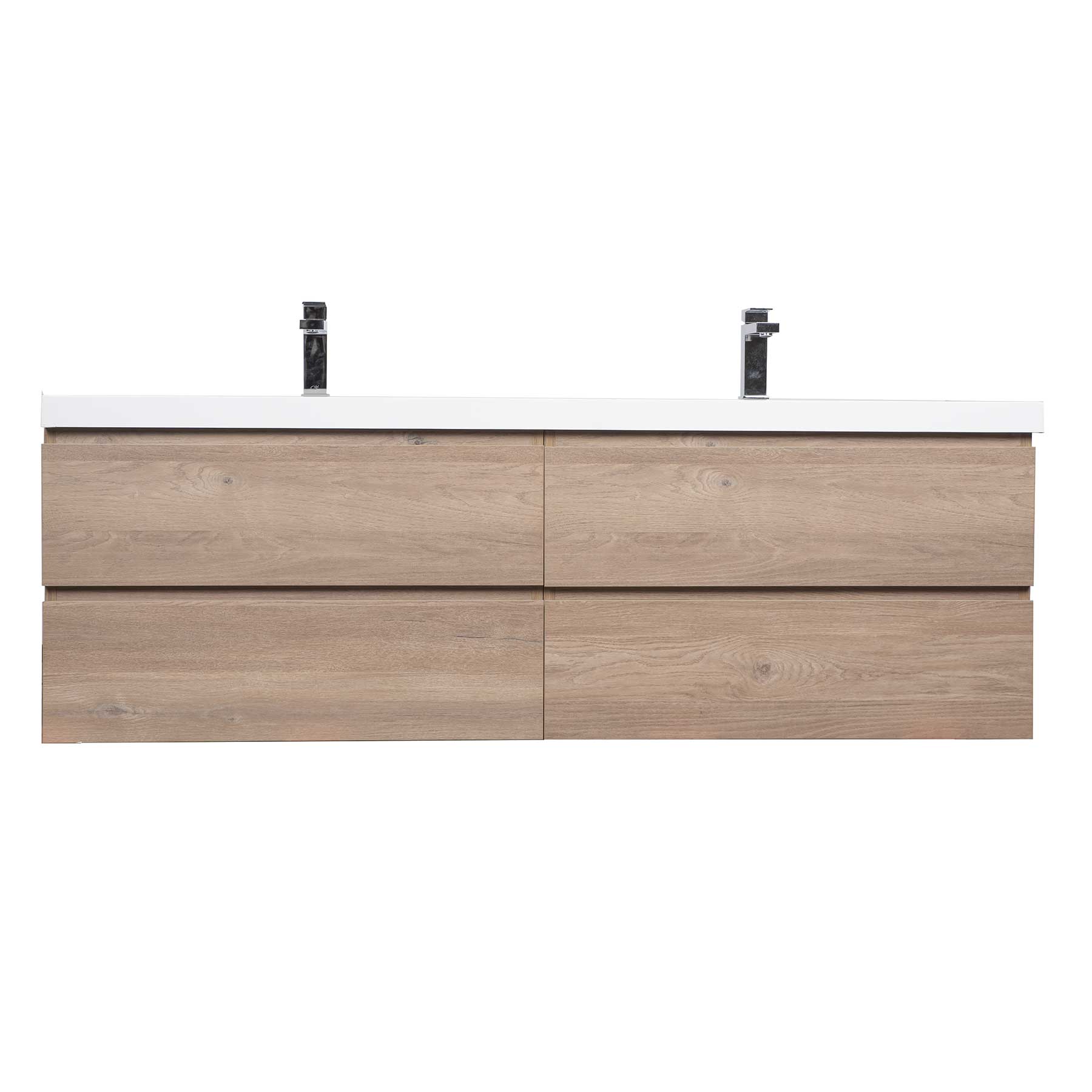 This 63" Angela wall mounted European styled double bathroom vanity features a large integrated counter and 4 soft closing drawers with cut out for plumbing, giving bathrooms tremendously clean, contemporary lines while exchangeable space. All the wooden elements are finished with a polyester resin finish to guarantee total water resistance. The elegant integrated resin countertop is fitted for a single faucet mechanism.