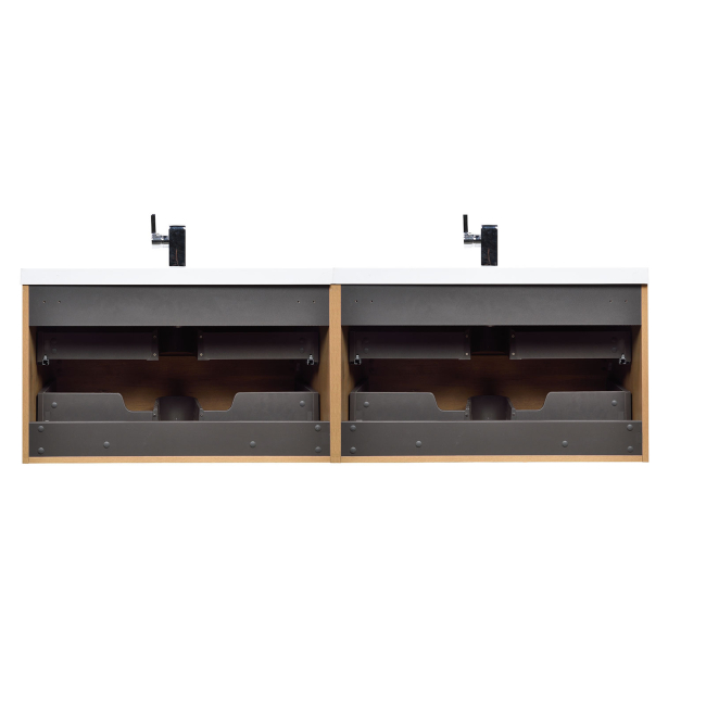 Measure up with handleless cabinetry there’s nothing nicer than clean, clutter-free countertops. With a one-piece top and trendy handleless drawers integrated into a single piece, this 71" Angela wall mounted double vanity is a textbook example of slick design.