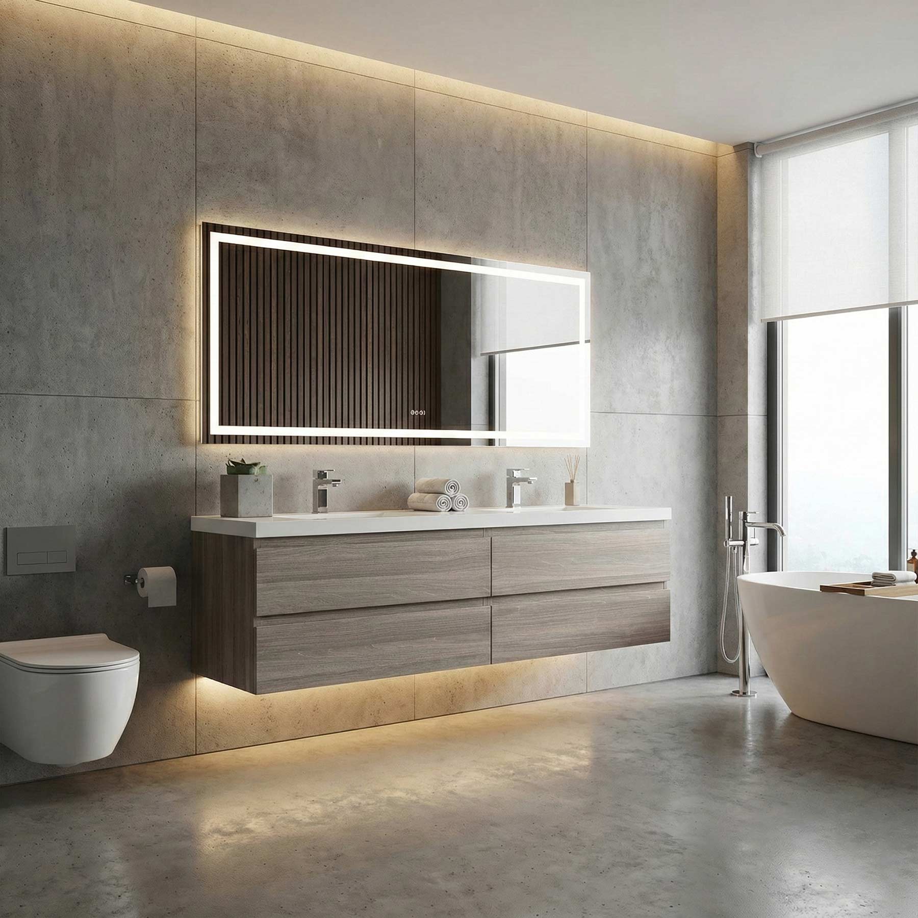 Measure up with handleless cabinetry there’s nothing nicer than clean, clutter-free countertops.  With a one-piece top and trendy handleless drawers integrated into a single piece, this Angela wall mounted double vanity is a textbook example of slick design.Â