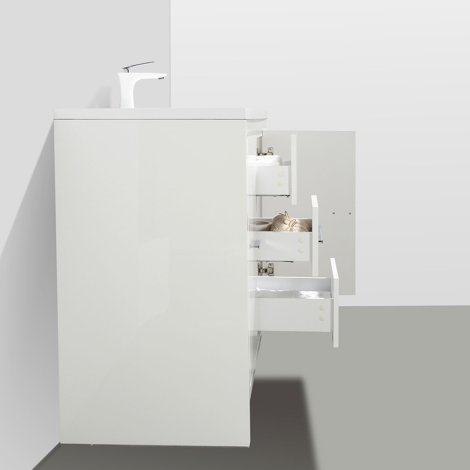 This single vanity has an alluring blend of traditional and modern influences. Perfecting the balance of hues and textures, this CBI Enna bathroom vanity has a single hole faucet mount with a pop-up drain for your convenience. With plenty of storage space in three functional drawers and two cabinets behind doors, this modern free-standing vanity accommodates all your bathroom products.Â