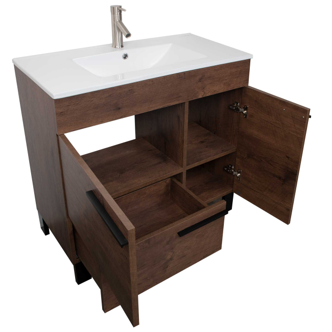 This 35.8 in. single vanity has an alluring blend of traditional and modern influences. Perfecting the balance of hues and textures, this CBI Enna bathroom vanity comes with a pure white ceramic counter top with single hole faucet mount, two doors and one drawer with soft closing mechanism. Countertop and Sink come on separate boxes for secure shipping and need minimal Installation