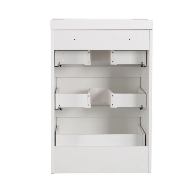 A spacious one basin vanity is a chic addition to any decor. Ideal for anyone looking for a winning combination of style, sleek design and size that brings it all together to present something dashingly urban. Featuring three fully functional soft-closing drawers, you'll never hear a drawer slam shut again. Constructed of white resin stone counter, a high quality wood/MDF cabinet in high glossy white finish.