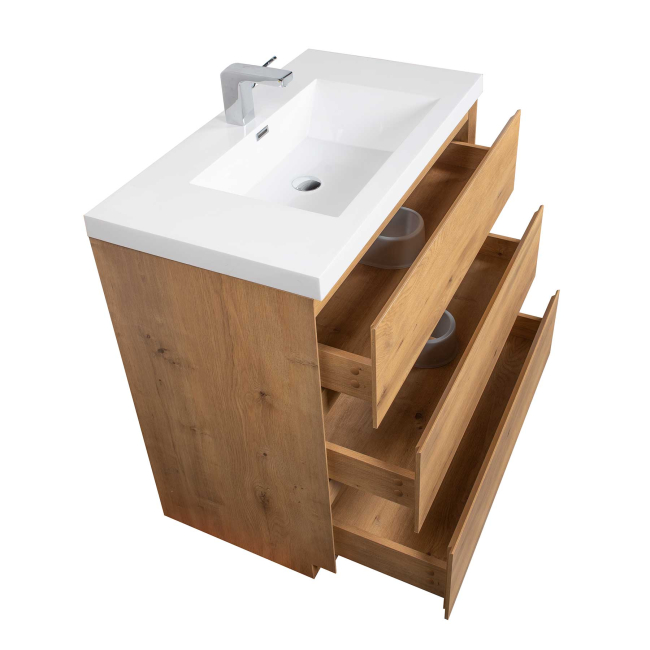 A spacious one basin vanity is a chic addition to any decor. Ideal for anyone looking for a winning combination of style, sleek design and size that brings it all together to present something dashingly urban. Featuring three fully functional soft-closing drawers, you'll never hear a drawer slam shut again. Constructed of white resin stone counter, a high quality wood/MDF cabinet in Rosewood finish.