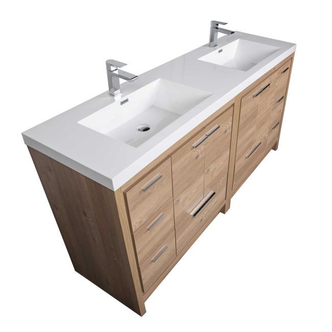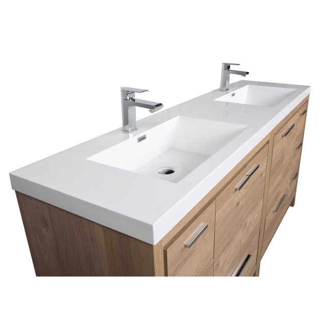 Live on the cutting edge with the Enna 70.8" bathrom vanity with double sink. This free standing vanity offers great storage with a smooth soft-closing, (8)fully functional drawers and (4)doors. This spectacular modern piece features integratged gloss white top and sink. Polished chrome drawer pulls add a compelling dash of visual contrast.