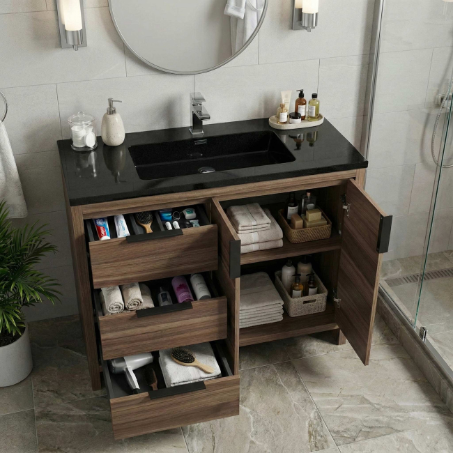 Evan 35.5" Modern Bathroom Vanity with black counter top, Walnut