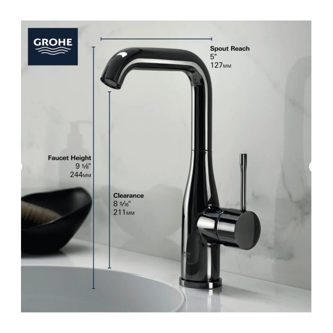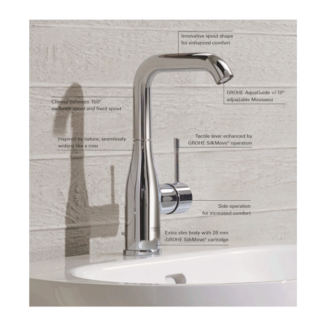 Sleek and sophisticated, the GROHE Essence Single-Handle Single-Hole Bathroom Faucet is a distinctive style with a gently curved swivel spout and side lever handle. This water-saving faucet reduces water usage while providing superior performance. Available in an array of exquisite, on-trend finishes. The Essence single-handle bathroom faucet embodies all the elements of precision craftsmanship and design excellence.