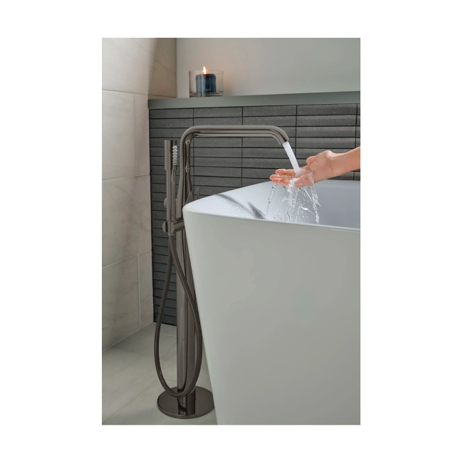 Sleek, sophisticated and available in an array of exquisite finishes, the GROHE Essence Floor Standing Tub Filler with Hand Shower adds a distinctive touch to your freestanding bathtub. Engineered with impressive features for today’s well-appointed home, the Essence Freestanding Tub Filler ensures superior performance with smooth, GROHE SilkMove handle operation, lasting beauty with the durable GROHE StarLight finish, and a relaxed experience with the Euphoria Stick Hand Shower featuring GROHE DreamSpray. This contemporary tub filler embodies all the elements of precision craftsmanship and design excellence that have made GROHE the choice for discerning homeowners.