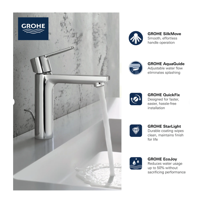 Clean, unpretentious lines define the GROHE Lineare Single Handle Bathroom Faucet. This contemporary faucet is equipped with exclusive GROHE technology including GROHE SilkMove for smooth, precise handle operation, and GROHE EcoJoy to reduce water usage without sacrificing performance. Lineare is engineered with the precision and craftsmanship that have made GROHE the choice for discerning homeowners.