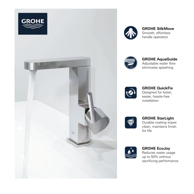 Elegant or minimalist, the GROHE Plus Centerset Bathroom Faucet combines the clean, linear angles of a cube with the gentle curves of a circle making it a distinctive choice no matter the design aesthetic. Engineered to bring comfort and convenience to your bathroom, the Plus Centerset faucet features GROHE SilkMove for smooth, precise handle motion and the durable GROHE StarLight coating for easy care and lasting beauty.