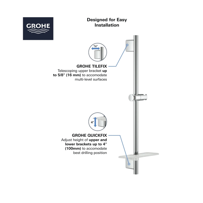 The sleek, slim GROHE Rainshower Shower Slide Bar adds understated elegance to your bathroom. Designed for maximum versatility, the hand shower holder adjusts for the perfect angle, the height-adjustable glider swivels to accommodate left or right-hand preference. Includes EasyReach tray for added convenience.
