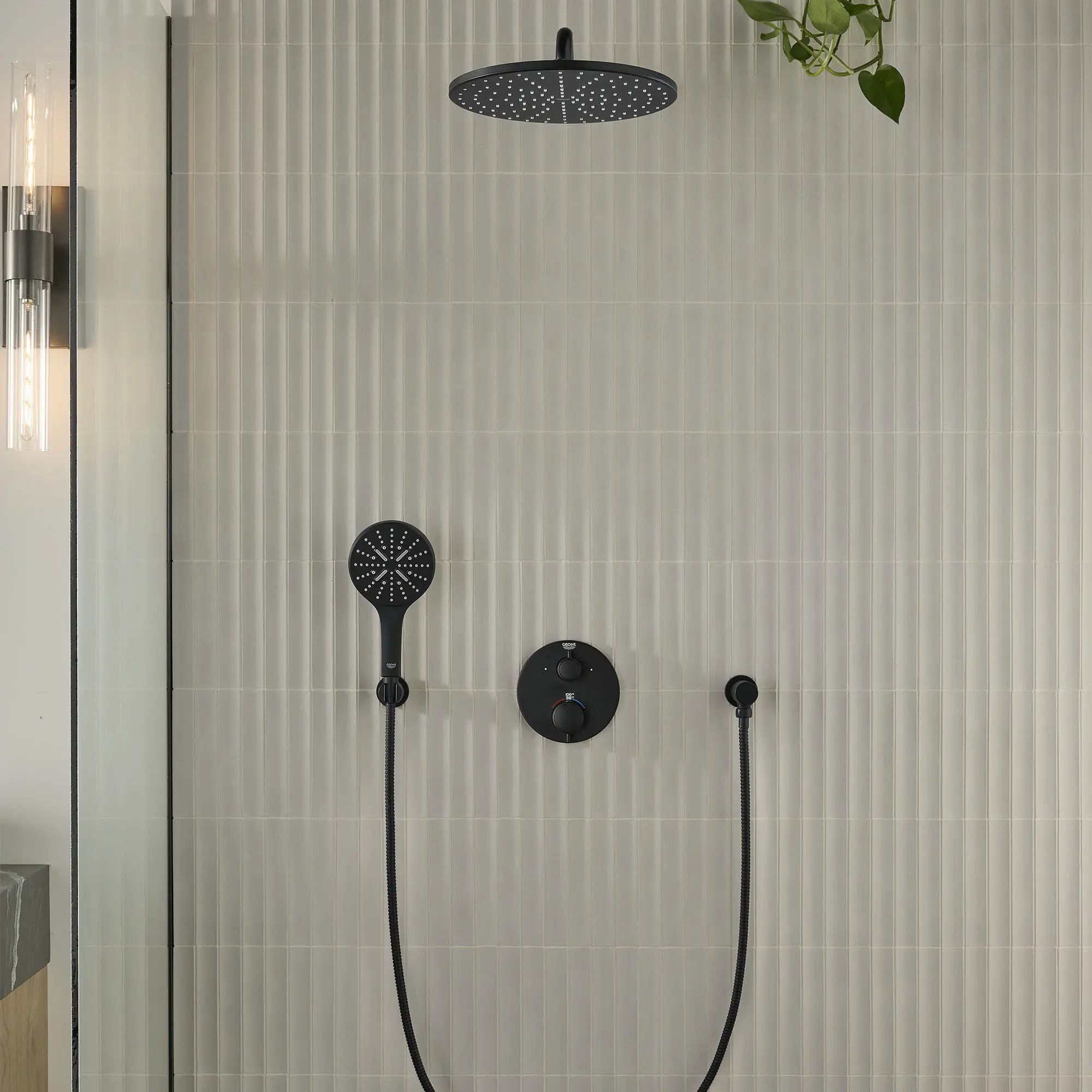 - Thermostatic temperature control with Grohe SafeStop safety button at 100°F/38°C