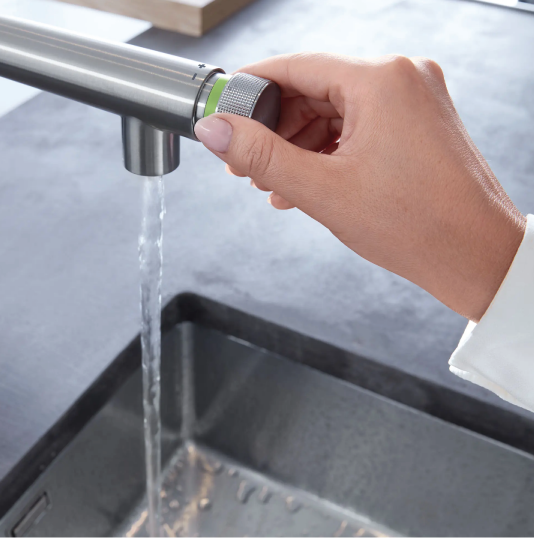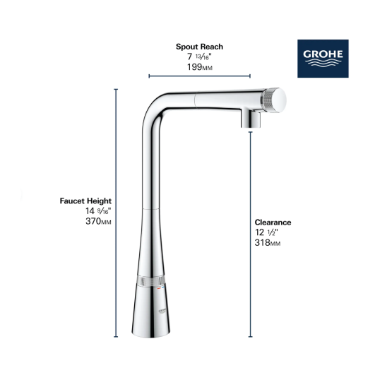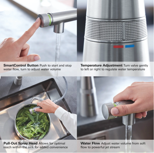 - PUSH-BUTTON ON/OFF: Exclusive GROHE SmartControl is an innovative kitchen faucet featuring a push-button tip on the spout to control on/off