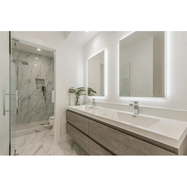Measure up with handleless cabinetry there’s nothing nicer than clean, clutter-free countertops. With a one-piece top and trendy handleless drawers integrated into a single piece, this 71" Angela wall mounted double vanity is a textbook example of slick design.