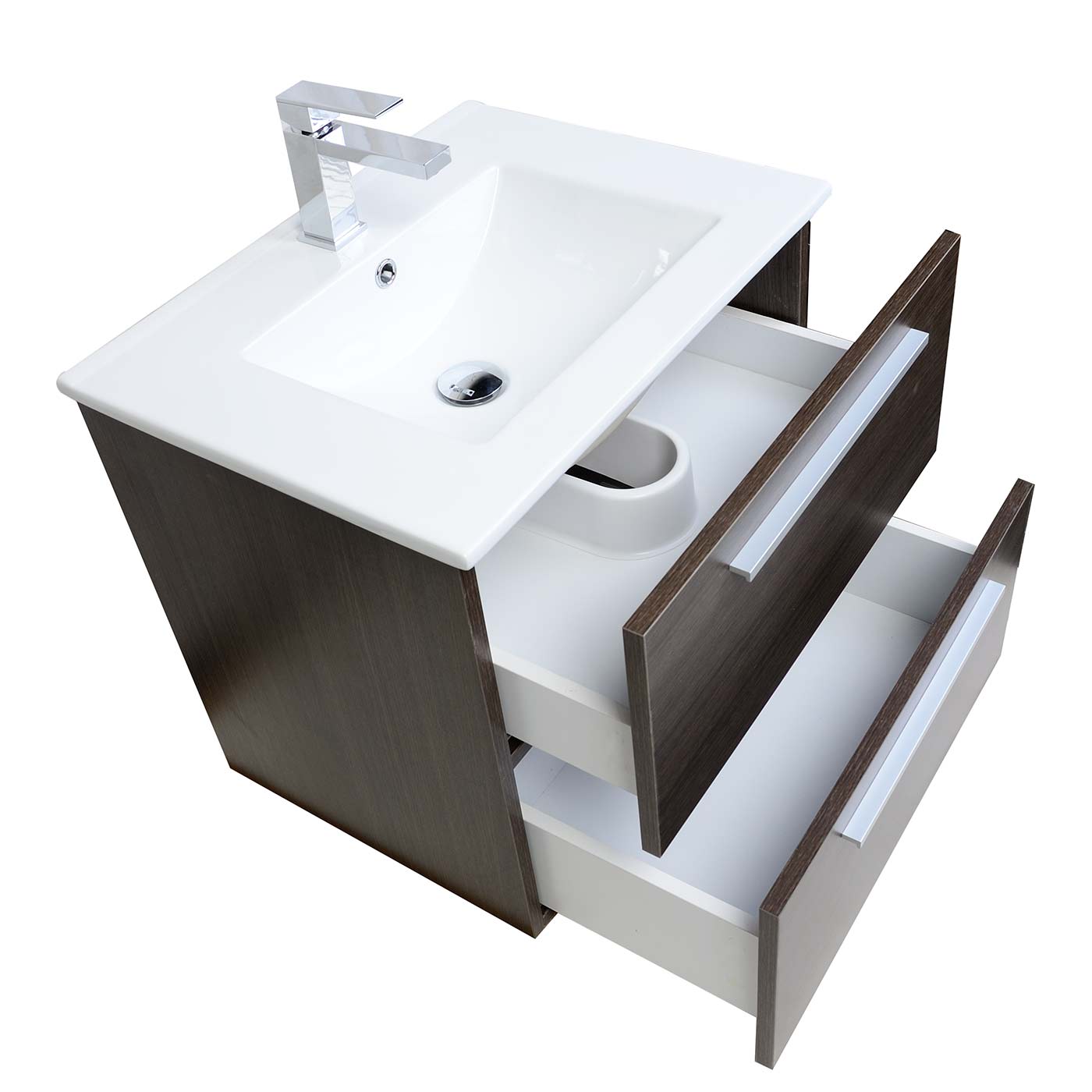 A wall hung bathroom vanity is the space-saving solution with style. Ideal for compact city homes, this European styled bathroom vanity frees up valuable floor space by being mounted to the wall, resulting in a larger looking bathroom with more fuctional design. This wall hung vanity features premium quality scratch-resistant finish, soft-closing drawers with damping technology, and a crisp clean integrated porcelain sink.Â