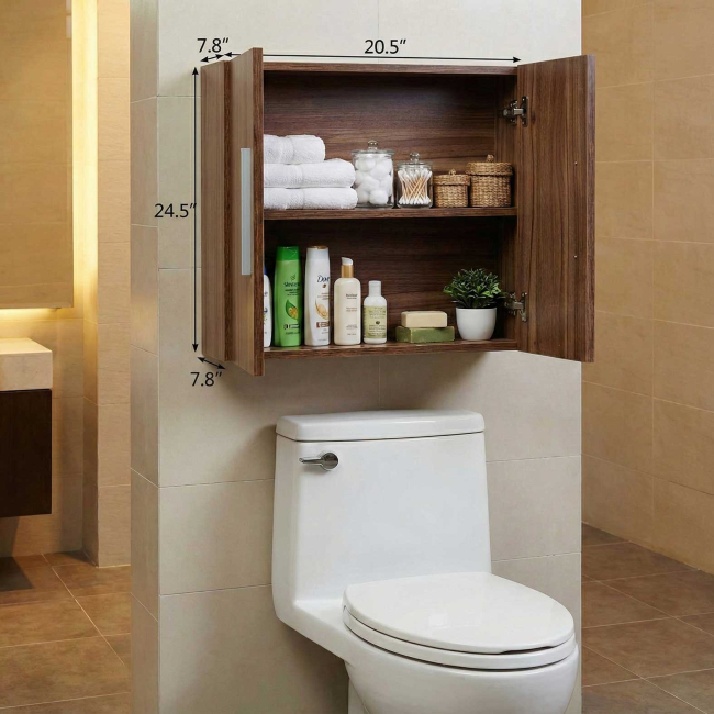 This chic space-saving cabinet is designed to fit in small bathrooms with its sleek, over-the-toilet design. Finished in Walnut, this contemporary cabinet is ideal for storing toiletries, towels and small decorative pieces. This cabinet comes with a built-in shelf for easy storage, it also features brushed finished pulls for easy opening.