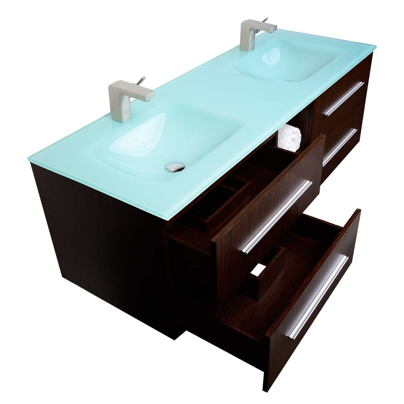 This Savona wall-mounted vanity delivers beautiful natural wood grain exteriors offset by modern satin nickel door pulls. This vanity provides a full complement of storage areas behind four fully functional drawers. For the convenience of installation, all the drawers are cut-out for easy plumbing. The sleek integrated tempered glass counter top makes cleaning a breeze. A wall-mounted vanity leaves space in your bathroom for you to relax.